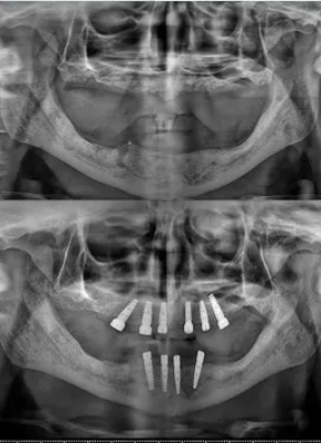 - Lower jaw: There was enough bone to place implants without needing bone grafts.
